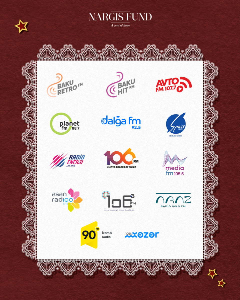 От имени Фонда «Nargis» выражаем глубокую благодарность радиоканалам, оказавшим медийную поддержку благотворительной ярмарке «Soyuq Əllər, İsti Ürək» 2025–2026: Xəzər FM, Araz FM, ASAN Radio, 106 FM, 106.3 FM, İctimai, Avto FM, Retro FM, Planet FM, Dalğa FM, Hit FM, Space FM, Radio Enerji FM и Media FM.