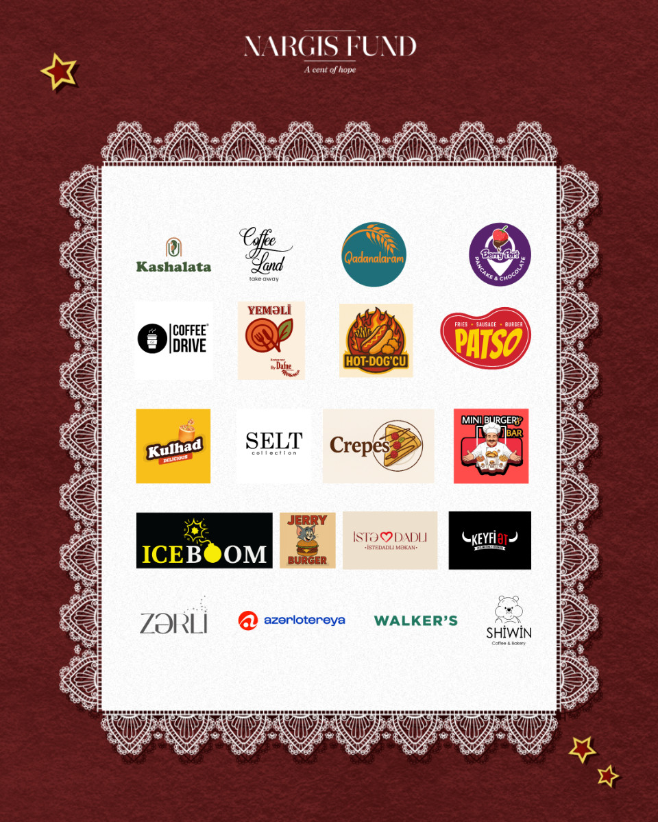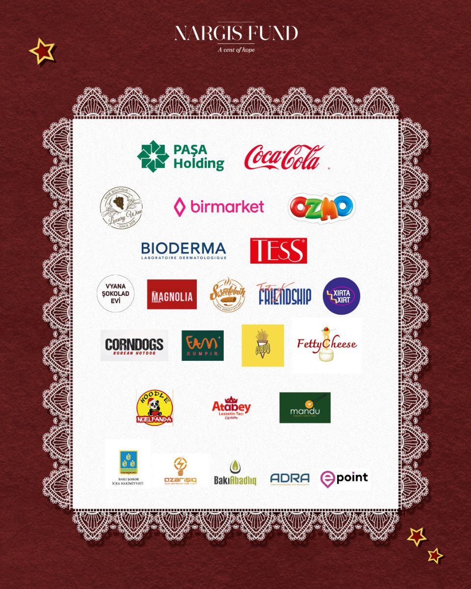 Как и каждый год, все средства, собранные от аренды домиков на благотворительной ярмарке «Soyuq Əllər, İsti Ürək», а также финансовая поддержка наших спонсоров направляются на оплату лечения и операций детей, страдающих от различных заболеваний. С чувством гордости и радости представляем вам спонсоров, партнёров и участников нынешней ярмарки.