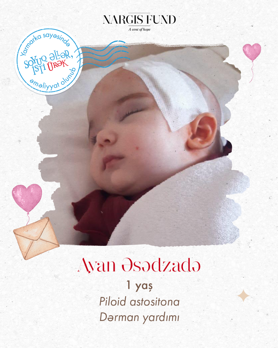 Ayan piloid astositoma diaqnozu ilə qarşı-qarşıya idi və müalicəsi üçün dərmanlara ehtiyac vardı. Xeyirxah insanların, tərəfdaşlarımızın və dəstəkçilərimizin birgə səyi sayəsində tələb olunan 3.400 AZN toplanmış, dərmanlar təmin olunmuş və müalicəsinə başlanmışdır.