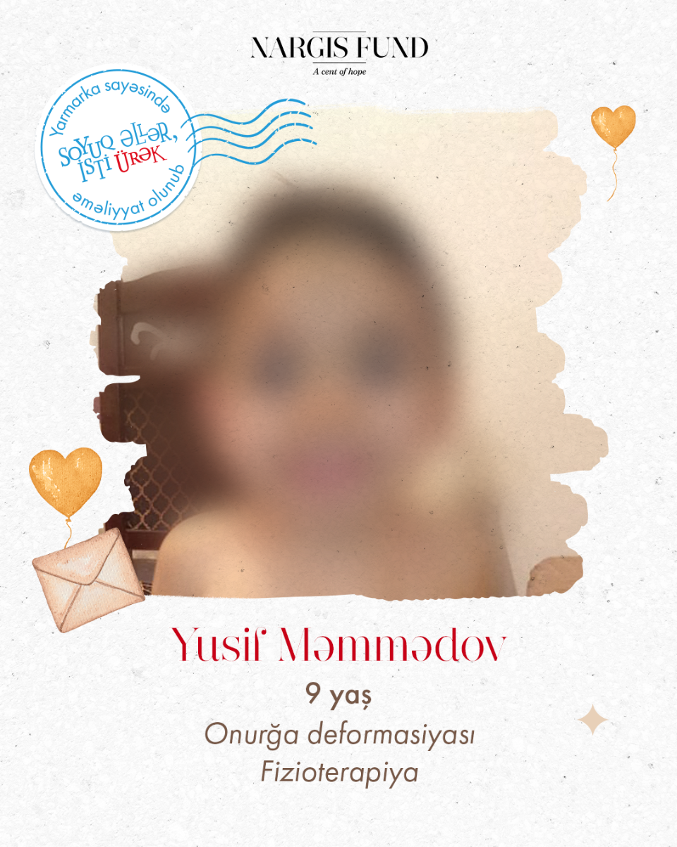 Yusif onurğa deformasiyası diaqnozu ilə müalicəyə ehtiyac duyurdu. Onun sağlamlığına qovuşması üçün tələb olunan 1.000 AZN məbləğ xeyirxah insanların, sponsorlarımızın və yarmarka evlərinin icarəsindən əldə olunan gəlirlərin dəstəyi ilə qarşılanmışdır. Göstərilən diqqət və qayğı sayəsində Yusifin müalicə prosesi təmin edilmişdir.